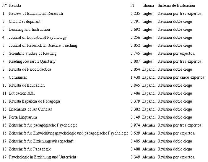 A tal efecto pretendimos analizar los criterios de evaluación utilizados para valorar la calidad y pertinencia de los manuscritos enviados a las diez revistas de carácter educativo indexadas en la Social Science Edition del Journal Citation Reports (JCR) en el año 2015 con mayor factor de impacto, editadas en alemán, en inglés y en español. La dimensión lingüística en la divulgación científica es un aspecto a considerar. Como consecuencia de la II Guerra Mundial, la derrota de Alemania, el descenso del estatus de Francia, etc. constituyeron factores que coadyuvaron a que en estos países las revistas de importancia pasaran a publicar en inglés a fin de evitar sufrir degradaciones (Arriaga, Nava & Moreno, 2017). No obstante, tras contactar infructuosamente con personal responsable de las distintas revistas en reiteradas ocasiones sin que nos facilitaran la información que precisábamos, optamos finalmente por delimitar las unidades de análisis a: cinco de las seis revistas sobre educación editadas en alemán, siete de las diez primeras revistas editadas en inglés y siete de las ocho únicas revistas existentes español. Por consiguiente, las unidades de análisis quedaron conformadas con un total de 19 revistas indexadas en Journal Citarion Reports 2014 bajo las etiquetas “Education & Educational research”, y editadas en las lenguas mencionadas (Thomson Reuters, 2015), las cuales son Child Development (2016), Review of Educational Research (2016), Learning and Instruction (2016), Journal of Educational Psychology (2016), Journal of Research in Science Teaching (2016), Scientific studies of Reading (2016), Reading Research Quarterly (2016), Comunicar (2016), Revista de Psicodidáctica (2016), Revista de Educación (2016), Enseñanza de las Ciencias, (2016), Educación XXI (2016), Revista Española de Pedagogía (2016), Porta Linguarum (2016), Zeitschrift für pädagogische Psychologie (2016), Zeitschrift für Entwicklungspsychologie und pädagogische Psychologie (2016), Zeitschrift für Erziehungswissenschaft (2016), Zeitschrift für Pädagogik (2016), Psychologie in Erziehung und Unterricht (2016). La principal estrategia de búsqueda empleada consistía en localizar las revistas objeto de análisis según las posibilidades que oferta la base de datos seleccionada (Navarro & Martín, 2013) para, posteriormente, proceder a la recopilación de información específica mediante las páginas webs de las propias revistas y/o poniéndonos en contacto con personal de la revista que pudiera proporcionarnos la información que precisábamos.