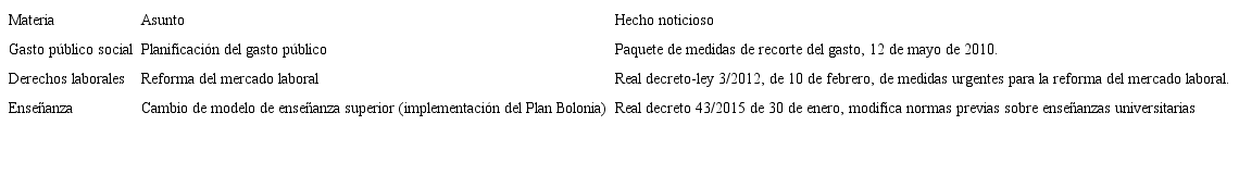 b. De los mismos hechos noticiosos: decisiones de gobiernos sobre medidas de ajuste y reformas estructurales en materias pilares del Estado de Bienestar −educación, derechos laborales, pensiones, sanidad.
