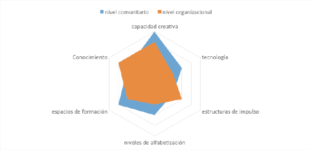 Según el gráfico, las competencias a nivel social son más débiles en la tecnología usada para los procesos de producción, que tiene que ver con la tendencia a buscar productos hechos por computadora, de forma especializada, cuando se pueden potenciar maneras alternativas, partiendo de los recursos propios. Las diferencias entre el espacio comunitario y el organizacional en este indicador, radican en gran medida en la generación de estrategias alternativas para producir. El componente más fuerte en ambos espacios es la capacidad creativa, que definitivamente tiene que ser mejor canalizada hacia una producción más fuerte.