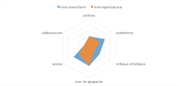 Las principales debilidades en estas competencias están en las políticas, que determinan tanto la carencia de elementos que guíen los procesos de socialización desde el punto de vista ético, estratégico y político; se manifiesta como el principal problema en ambos contextos. En el caso de la principal fortaleza en estas capacidades, tenemos los canales y medios en el caso de las comunidades, teniendo en cuenta su diversidad, aunque puede mejorar; y en el caso del contexto organizacional se comportan de forma similar los canales, los niveles de acceso y los niveles de alfabetización.
