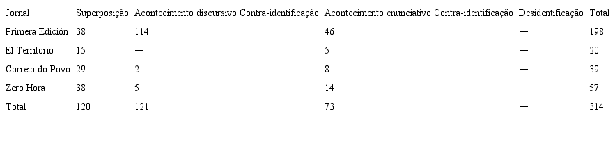 Na batalha cotidiana de publicação sempre há espaço para mudanças de rumo, mas precisam existir argumentos. E a informação privilegiada é um dos expedientes que tem maior peso nas decisões editoriais. É difícil não publicar um furo. Claro que muito material é engavetada por força da ação de autoridades que não desejam a divulgação de informações que possam virar a opinião pública contra suas ações. Mas não é só a questão política. Falo aqui da questão jornalística. Falta sim proximidade cultural com os ribeirinhos. Os moradores do local não são jornalisticamente relevantes para os diários analisados. As vozes surgem em raras ocasiões dentro da amostra. Nos jornais Correio do Povo e El Território não se encontram falas da população. No jornal Zero Hora, apenas em uma reportagem. E no jornal Primera Edición, a palavra da população em geral – não especialistas – também é limitada, mas presente. Sustento esta afirmação com a análise dos noticiários presente na síntese exposta na tabela abaixo, que diferencia os acontecimentos discursivos (Pêchueux, 1988). No Brasil, foi Indursky que diferenciou os tipos de acontecimentos, sendo que o acontecimento discursivo é aquele em que se dá, dentro de um discurso, o surgimento de uma nova forma-sujeito e, por conseguinte, de uma nova formação discursiva. Vale dizer: a ruptura é radical e definitiva; o sujeito não suporta mais os saberes da formação discursiva em que se inscrevia e com ela se desidentifica, dela se retirando. Este movimento o conduz necessariamente para a instauração de uma nova formação discursiva e a produção de novos saberes. (Indursky, 2008, p. 28). Por outro lado, temos o acontecimento enunciativo. Este acontecimento implica apenas na instauração de uma nova posição-sujeito no interior de uma mesma FD. Dito de outra forma: surge aí uma nova fragmentação em relação à forma-sujeito, ou seja, surge aí um novo modo de enunciar os sentidos no interior de uma formação discursiva, mas este novo modo não opera pelo viés da ruptura com a formação discursiva e com a forma-sujeito. (Indursky, 2008, p. 28). Dito isso, passamos para a tabela desta pesquisa.