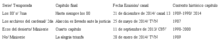 Como podemos observar, cada serie organiza su trama narrativa en un arco temporal específico, cuya amplitud (Genette, 1989) –extensión del tiempo de la historia– varía aunque todas se centren en el periodo dictatorial (1973-1989). Por otro lado, a pesar de que su difusión en algunos casos se inició antes de 2013, los capítulos finales fueron emitidos entre el 11 de septiembre de 2013 y el 21 de diciembre de 2014, y pueden ser leídos como la síntesis final del periodo denominado de transición a la democracia, que se inició con el gobierno de Patricio Aylwin en marzo de 1990.