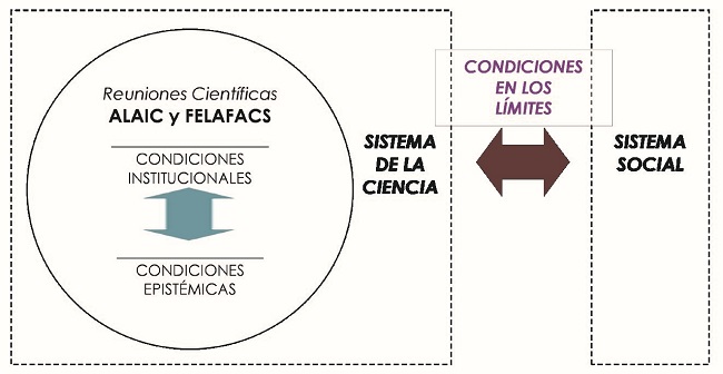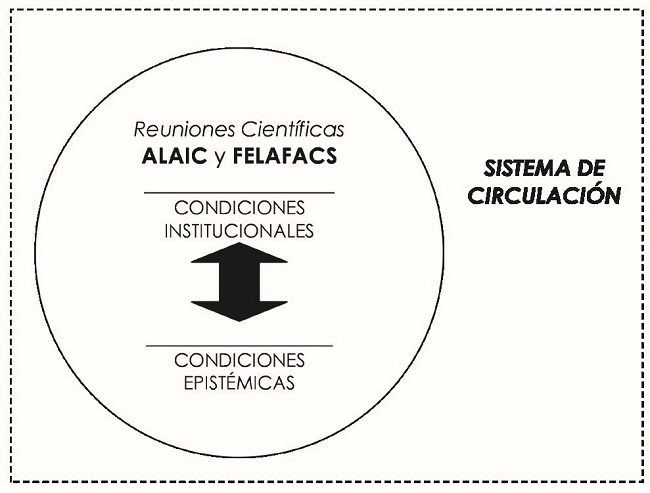 Considerando que, dependiendo del tipo de procesos y trasformaciones −endógenas o exógenas− analizadas (García, 2006, p. 56), la dinámica de un subsistema puede estudiarse como sistema en un determinado “nivel de estudio”, nuestro objeto se sitúa en uno de los dominios específicos del sistema de circulación del conocimiento: los congresos y encuentros científicos regionales, donde se localiza una parte esencial del flujo de discursos que definen las condiciones epistémicas de la investigación científica. En este punto fundamental nuestra tesis ha subrayado la relevancia de ALAIC y FELAFACS en cuanto a su capacidad de definición de las condiciones de producción de la comunidad científica de América Latina y su función de legitimación y reconocimiento dentro del sistema de la ciencia, en tanto “sistema de producción de creencias” (Samaja, 1993, p. 24).