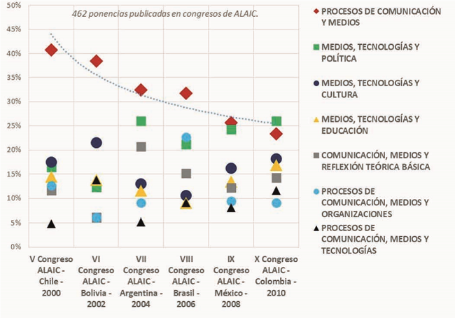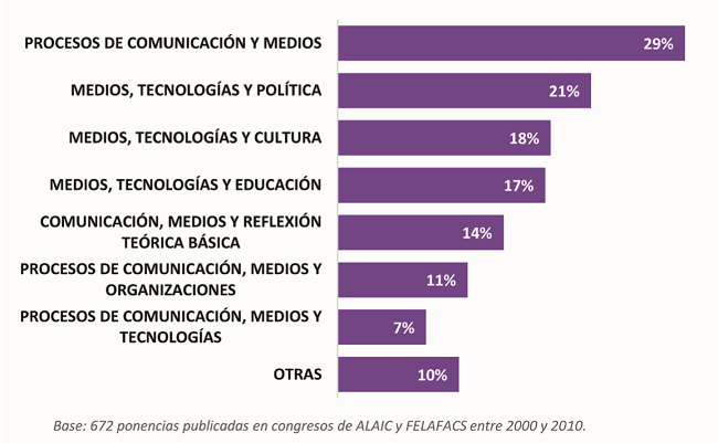 Uno de los aspectos sobresalientes del trabajo de los investigadores académicos durante 2000-2010 fue la disminución del poder específico de la reflexión sobre Medios de Comunicación, frente al afianzamiento de la investigación sobre Medios y Tecnologías, especialmente en relación con tres campos de estudio: Comunicación y Política; Comunicación y Cultura; y Comunicación y Educación5. El Gráfico 1 muestra las categorías temáticas (ejes de problematización) donde se concentró el grueso de los discursos de la investigación latinoamericana de la Comunicación que circuló en los congresos y reuniones científicas de la década de 2000.