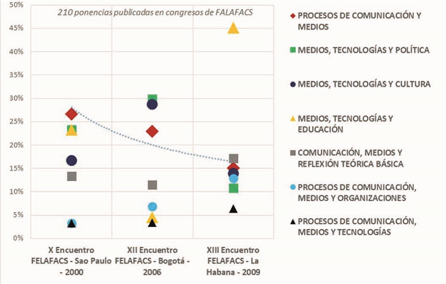 El Gráfico 3 muestra las trayectorias que esos mismos núcleos de problematización siguieron dentro de los encuentros de FELAFACS. Aún con ciertas diferencias de escala, en ambos casos (ALAIC y FELAFACS), el análisis longitudinal indica un marcado descenso de los enfoques asociados a cuestiones tradicionales sobre Medios de Comunicación y Procesos de Comunicación, cuya contrapartida fue el ascenso (fundamentalmente en el caso de ALAIC) y/o conservación de temas que vinculan Comunicación con Política, Cultura, Educación y Tecnologías.