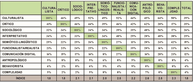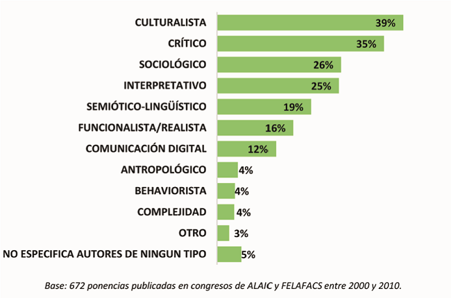 El 19% de los trabajos registra menciones a autores y/o corrientes teóricas que agrupamos dentro del paradigma semiótico-lingüístico, en sus dos vertientes mayoritariamente referenciadas: teoría socio-semiótica . criticismo literario. Con un 16%, sigue el denominado paradigma funcionalista-realista (Orozco Gómez, 1996; Moragas Spà, 2011), donde situamos a las corrientes agenda-setting, difusionista, ecología de los medios, psicología cognitiva, positivista, teoría de los efectos, funcionalismo sistémico y los exponentes de la Mass Communication Research. Con un 12%, el paradigma de la comunicación digital (Moragas, 2011), dentro del cual se localizan figuras como Castells, Scolari, Lévy y Piscitelli; y, finalmente, un 12% de los trabajos se distribuye entre los paradigmas antropológico de Augé, Ribeiro y Lima, behaviorista (Moragas Spà, 2011) y de la complejidad (Moyano, 2016, p. 150-152).