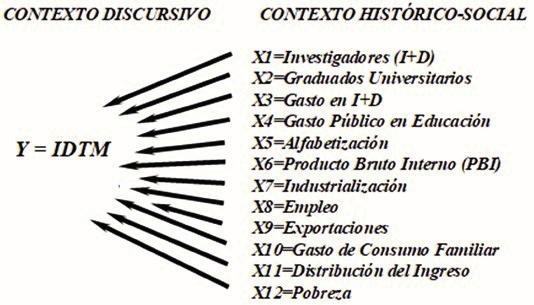 Para explicar los procesos de estructuración en el denominado “segundo nivel de análisis”, centrado en la acción de los factores del contorno del sistema ALAIC/FELAFACS (Moyano, 2016, p. 249) exploramos las relaciones entre contexto histórico-social y contexto discursivo por medio de la modelización con técnica de regresión OLS (Ordinary Least Squares)9. El objetivo del análisis de regresión fue explicar los cambios en el nivel de las prácticas teórico-metodológicas que se comunican en las ponencias a partir de las transformaciones operadas en una serie de indicadores del sistema social de los países de origen de las mismas durante el periodo observado (2000-2010). Llamamos a estos indicadores “variables explicativas” (“X”) y designamos como “variable a explicar” (“Y”) al factor que permite traducir empíricamente el concepto “prácticas teórico-metodológicas”: el Índice de Desarrollo Teórico-Metodológico (IDTM).