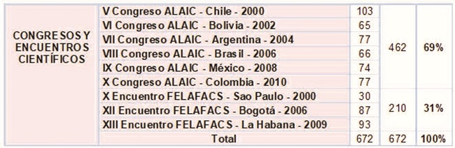 La Tabla 1 muestra la distribución del corpus de materiales textuales, conformado por 672 ponencias publicadas en reuniones científicas regionales durante el período 2000-2010: 462 (69%) correspondientes a seis congresos organizados por ALAIC y 210 (31%) a tres encuentros de FELAFACS.