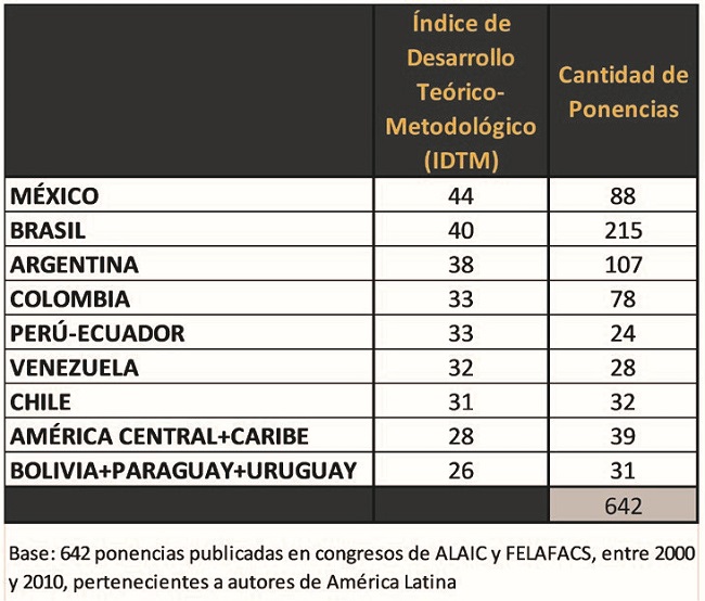 La Tabla 3 incluye el listado de países de origen de las ponencias relevadas y su IDTM. El análisis comparativo revela que las ponencias de los investigadores mexicanos, en primer lugar, y brasileños, en segundo lugar, registran prácticas científicas cuyo nivel de desarrollo teórico-metodológico supera la media general de América Latina.