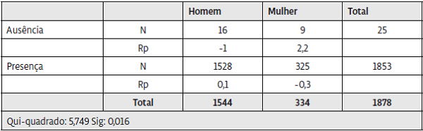 Os dados referentes ao qui-quadrado são significativos (5,749) e indicam que há diferenças na distribuição dos segmentos com e sem fala entre homens e mulheres. Nota-se uma predominância de segmentos com fala –o N– que representa o número de casos. Assim, o número de segmentos com fala é de 1.853 dos 1.878 totais, o que equivale a 98,6%. Esse é um valor, inclusive, bem acima dos 70% encontrados por Cervi (2011) nas eleições de 2006. Isso mostra que os candidatos, de modo geral, estão tendo mais espaço durante a propaganda na televisão. Após observar esses dados gerais e o qui-quadrado significativo, é possível analisar os resíduos padronizados8 (Rp), que vão indicar onde estão as relações de proximidade. Aqui nota-se que há uma concentração –ainda que com um número pequeno– de casos de segmentos sem falas entre as mulheres, já que o resíduo de 2,2 é positivo.