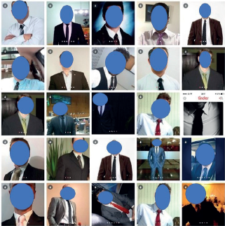 O campo sempre nos mostra algo que até então parecia “escondido” do nosso olhar. Um aspecto no vestuário dos correspondentes chamou nossa atenção enquanto navegávamos pelos perfis no Tinder. Conforme Simão e Mesquita (2010), para além da exposição de um corpo sarado, os homens de terno eram tão presentes e constantes quanto os sem camisas. Os ternos masculinos, geralmente na cor preta, refletem uma posição social. Para John Harvey (2004), o terno preto emite poder, bens e autoridade, numa representação que vai além das aparências, refletindo as relações entre os homens na sociedade, pois, para o autor, “é evidente que as roupas significam alguma coisa, e prova disso é a dificuldade em imaginar uma roupa que não tenha significado algum” (Harvey, 2004, pg. 38). Para Simão e Mesquita (2010), o terno assume um valor simbólico, e a materialidade dos signos que envolvem o objeto passa a ter certa importân- cia na afirmação de um vestuário clássico e atemporal. Assim, a publicização dos selfies de terno partindo do vestuário num ambiente de hiperconexão, onde a experiência individual está a todo tempo sendo reportada à rede, no sentidode Latour (2008), de fluxos, circulações, alianças, movimentos, que não se posicionamcom fixidez num ponto, mas sendo fluído, inconstante e escorregadio.Pensamos também o selfie como um ator não-humano, em conformidade com ateoria do ator-rede de Bruno Latour (2008), agente promotor de uma nova visualidadee que integra as demais visualidades ao permitir que os agentes humanospromovam formações imaginárias, representações e criem modalidades de siatravés de imagens técnicas.