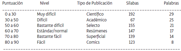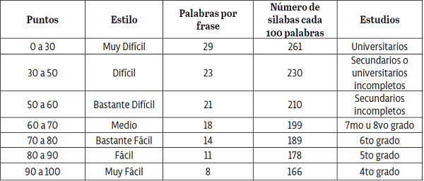 En la tabla 1 se pueden observar los índices de legibilidad obtenidos como parte del desarrollo de la fórmula de perspicuidad de Szigriszt. Además de las categorías de estilo (niveles de dificultad), la cantidad de palabras por frase que se estima por cada nivel, el número estimado de palabras por cada 100, el tipo de publicación que se infiere que pertenece a cada índice de legibilidad y los estudios que se estima que debe tener un lector según el nivel de dificultad del texto.