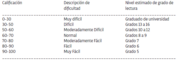 Fernández (1959) definía “lecturabilidad” como “proceso que está íntima- mente unido con la comprensión lectora. Más específicamente quiere decir la posibilidad de que los términos empleados en un libro y su estructura sin- táctica interesen comprensivamente a los lectores”. Las calificaciones de la fórmula de Huertas varían entre 0 a 100, 0 como lo más difícil y 100 como lo menos difícil para leer. Una calificación inferior a 30 se considera muy difícil, mientras una calificación de 70 se considera apropiada para lectores adultos. Para entender su calificación, se presenta a continuación la figura 3 con las equivalencias correspondientes aplicadas a la Fórmula Facilidad de Lectura de Fernández Huerta y que es comúnmente utilizada para investigaciones sobre legibilidad en el campo de la salud.