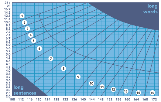 La Fórmula de Fry (1963), denominada Fry Readability Graph (FRG), fue validada para los idiomas español e inglés. Para implementar la FRG es necesario seleccionar tres pasajes de un texto que contengan 100 palabras cada uno. Los textos deberán ser seleccionados del comienzo, la mitad y el final del pasaje. Después se anota el total de número de oraciones y sílabas por cada 100 palabras. Luego se calcula el promedio de las oraciones y sílabas y el resultado es reflejado en una gráfica y los puntos reflejados en esta establecen el nivel de grado del texto. Una ilustración de la gráfica de Fry es presentada en la figura 4.