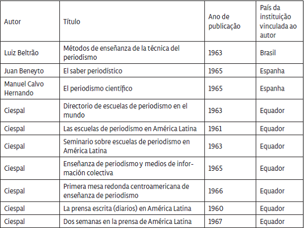 No texto de Córdova (1967) são mostrados 42 livros entre 1960 e 1967, e Nuñez (1980) afirma que a quantidade de títulos publicados pelo Ciespal, em julho de 1971, era de 70, com um total de 105 mil exemplares. Parte desses livros foi elaborada por autores que estiveram no Equador ministrando cursos no Centro, como também pode ser notado ao compararmos os nomes do quadro anterior com os a seguir.