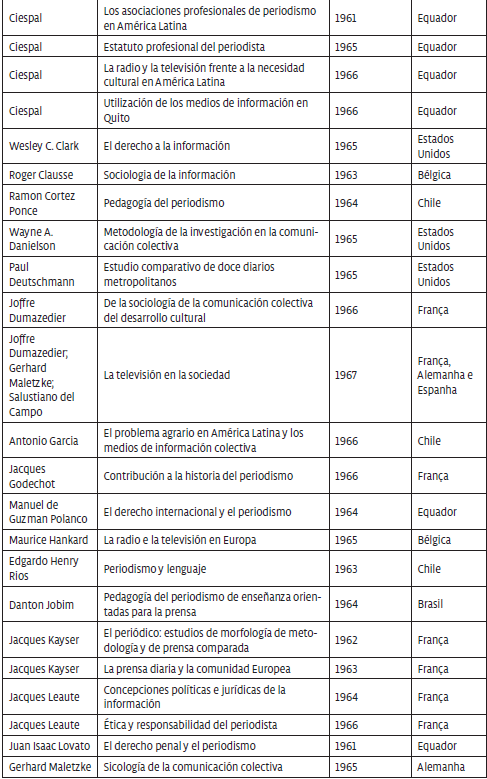 Algumas dessas obras foram elaboradas a partir de cursos ministrados no próprio Centro, como a Métodos de enseñanza de la técnica del periodismo, de Luiz Beltrão, feita com materiais dos cursos de 1963; a El saber periodístico, de Juan Beneyto, montada com o material do V Curso Internacional de Perfeccionamiento en Ciencias de la Comunicación; a De la sociología de la comunicación colectiva del desarrollo cultural, de Joffre Dumazedier, que é resultado de uma recopilação das conferências desse professor durante os Cursos Internacionales de Perfeccionamiento en Ciencias de la Infornación Colectiva entre os anos de 1964 e 1966; a El derecho a la información, de Wesley C. Clark, também uma recopilação de suas falas nos Cursos Internacionales de Perfeccionamiento en Ciencias de la Información Colectiva; a Sicología de la comunicación colectiva, de Gerhard Maletzke, que foi elaborada a partir de suas participações nos cursos do Ciespal em 1962 e 1963.