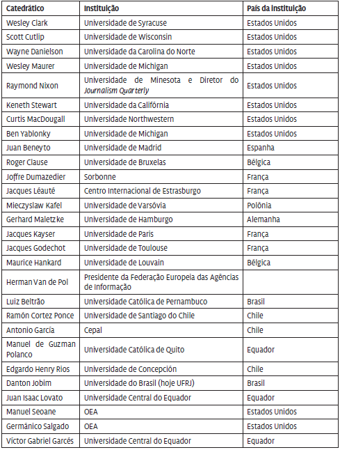 Em As Ciências Sociais na América Latina, as áreas de investigação debatidas foram Economia, História, Geografia, Sociologia, Antropologia, Ciência Política e Direito. Florestan Fernandes (1965), lembrando de profissionais que “confluem com o ponto de vista sociológico”, citou geógrafo, historiador, psicólogo social, economista, antropólogo, cientista político e jurista. Nada que recordasse a Comunicação Social (e suas subáreas) foi mencionado. Se as Ciências Sociais ainda estavam saindo do amadorismo nos anos de 1960 na América Latina, conforme Diégues Júnior (1965), não é motivo de surpresa que a Comunicação não fosse lembrada, pois os Centros de Pesquisa latino-americanos com incidência na região surgem no final dos anos 1950, como o Ciespal (Centro Internacional de Estudos Superiores de Comunicação para a América Latina) e o Instituto Venezuelano de Investigações de Imprensa, ambos de 1959; o Ceren (Centro de Estudios de la Realidad Nacional), em 1970; o Ininco (Instituto de Investigaciones de la Comunicación) em 1973 (Berger, 2001, p. 246).