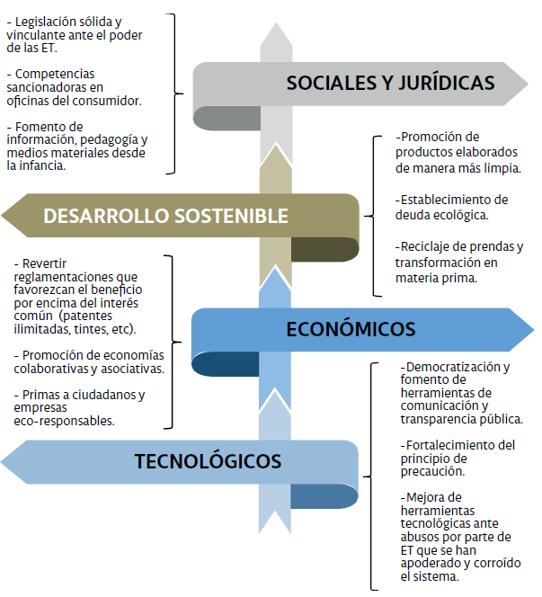 Para el filósofo Sádaba (2015), “Un consumo consciente y sostenible puede transformar la orientación sociopolítica del mundo”, ahora bien, “todo esto exigirá movimientos sociales serios y una constante pedagogía”, paradigma lejos de concretarse ya que “El cambio social ante las nuevas perspectivas, precisa también de un cambio en las estructuras de producción y de prestación de servicios (socialización o economía colaborativa) que no creo que los grandes conglomerados industriales y sus lobistas estén dispuestos a permitir. (Bonet, 2015). Lo apéndices de las ET textiles se imbrican y establecen mediante todo tipo de conexiones, prejuzgando, condicionando nuestras voluntades, nuestros patrones de trabajo, familia, modelo de vida y actual arquetipo de sociedad siendo esta cada vez más opulenta. Se ha generado un nuevo comportamiento del consumidor, tanto a la hora de crear nuevos productos así como a la hora de adquirirlos (Hendarwan, 2002; Crane & Matten, 2004).