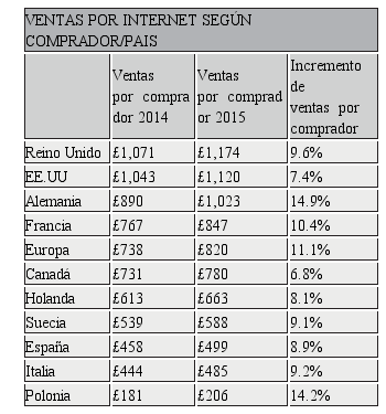 Según la Tabla 1, “Ventas por Internet”, se puede observar de manera gráfica el importe desembolsado por consumidor según determinados países, entre los años 2014 y 2015, así como su incremento porcentual, circunstancia cumplida sin excepción en todos los casos seleccionados.