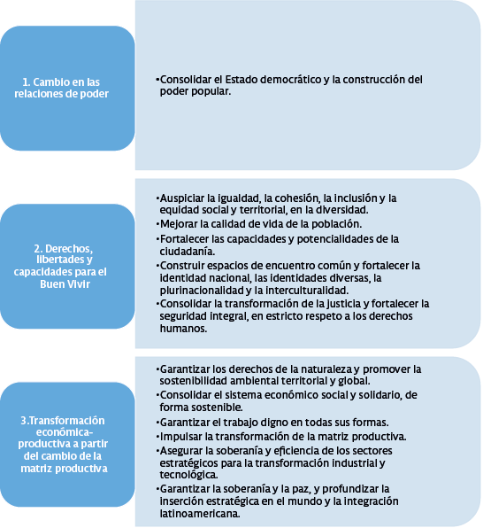 La propuesta política desarrollada en Ecuador se encuentra en el “Plan Nacional para el Buen Vivir, 2013-2017”, PNBV. El cual no trata de un nuevo paradigma de desarrollo, propone otras prioridades para la organización social, y considera pautas distributivas y redistributivas. Dado que Ecuador, como país andino, construye sus derechos “sobre un concepto y visión del mundo nacido en las antiguas sociedades de la región de los Andes sudamericanos: el Buen Vivir es el Sumak Kawsay” (Senplades, 2012, p. 16).