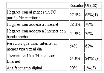 elaboración propia.Este estudio se realiza en Ecuador, un país latinoamericano en los que en estos últimos años se han producido progresos a nivel de infraestructura de acceso a Internet. Se trata de un país que se encuentra en el puesto 82 del Networked Readiness Index (NRI) (Bilbao-Osorio et al., 2014), en el que el 64% de la población accede diariamente a Internet, si bien, el ancho de banda suele ser lento (ITU, 2014). Aunque a nivel de frecuencia de uso de Internet no se puede afirmar que exista una brecha notable respecto a países desarrollados, persiste una brecha a nivel de infraestructuras, precios, hogares con acceso y penetración en el tejido socio-productivo (empresas, instituciones o servicios) (Bilbao-Osorio et al., 2014; ITU, 2014). Por tanto, partimos de la creencia de que esta brecha material respecto a los países desarrollados afecta a otros niveles de brecha relativos al tipo de uso, alfabetización y beneficios que la ciudadanía obtiene del uso de Internet en los diferentes planos de la vida.