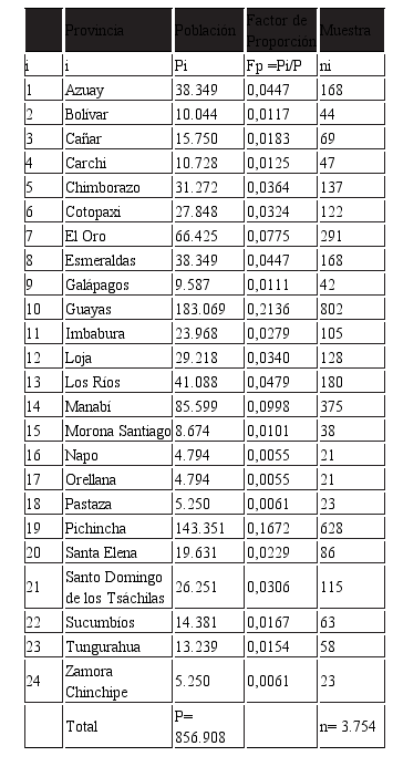 Para ello se empleó la fórmula siguiente: ni=n* (Pi / P). Siendo i=número de provincias; n=tamaño de la muestra; ni=tamaño de la muestra del estrato i (provincia); Pi=población de la provincia i; P=población comprendida en edades desde los 16 años hasta los 18 años.