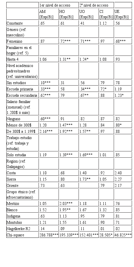 Para responder a la CI 2, con el objetivo de identificar la influencia de las variables socio-demográficas sobre los dos tipos de acceso a Internet, se utiliza la Regresión Logística (RL). Las variables dependientes son los cinco tipos de acceso. Cada una de estas variables se transforma en variables dummy. Las variables independientes utilizadas son las siguientes: género (masculino y femenino), ingresos familiares mensuales (ref. cuartiles: sin ingresos, <300$, de 300$ a 1.199$, y ≥1.200$), actividad principal (solo estudia y estudia-trabaja), nivel de estudios del padre/madre (sin estudios, primarios, secundarios y universitarios), número de familiares en el hogar (ref. cuartiles: hasta 4 y más de 4), grupo étnico (mestizo, blanco, indígena, montubio y afro-ecuatoriano), y región (Costa, Sierra, Oriente y Galápagos).