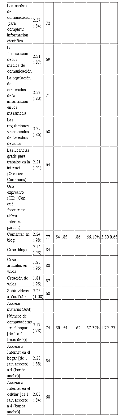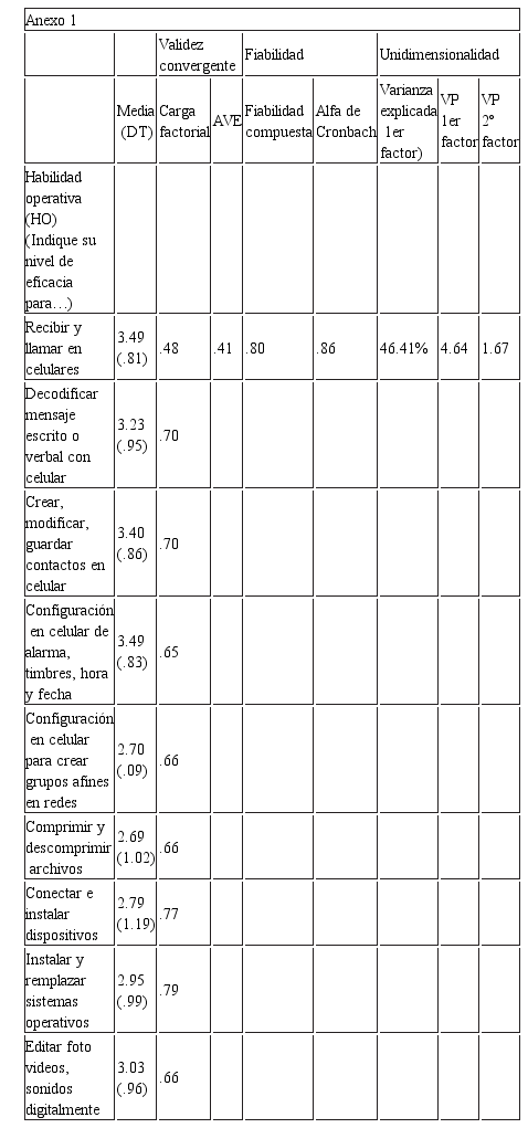 En el Anexo 1 se muestran los resultados descriptivos de cada una de las variables consideradas en cada constructo, así como las propiedades de cada uno de los constructos utilizados en el estudio. Cada constructo se identifica con un tipo de acceso a Internet.