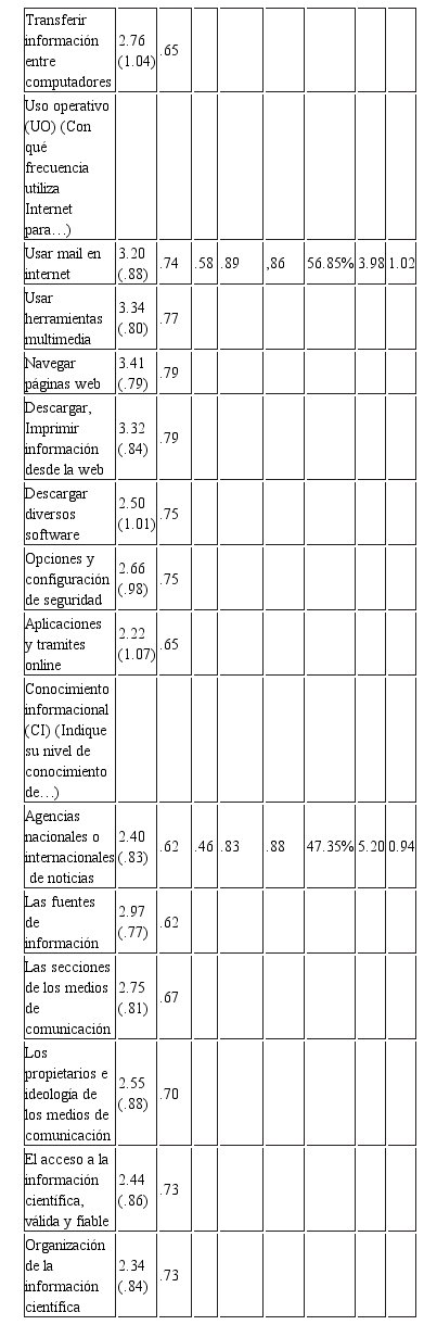 Para responder a la CI 1 se elaboran 5 constructos con el objetivo de medir los 5 tipos de acceso a Internet considerados (Buckingham, 2007; Aguaded, Tirado & Hernando, 2014). Cada uno de los constructos usa una escala de medida ordinal, tipo Likert con valores de 1 a 4. Cada constructo corresponde a uno de los dos niveles de acceso. El primer nivel hace referencia al acceso material y capacidad de usar Internet, para lo que se construyen tres constructos: a) acceso material (AM); b) habilidad operativa (HO); y c) uso operativo (UO). El segundo nivel hace referencia a la alfabetización de los usuarios respecto a Internet como medio de comunicación, información y expresión, para lo que se construyen dos constructos: a) conocimiento informacional (CI), y b) uso expresivo (UE).