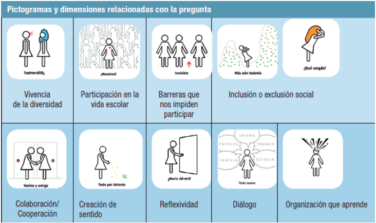 En este apartado se presentan los principales resultados en relación con el objetivo de la investigación. Para facilitar el diálogo en los grupos de discusión se utilizó un material elaborado por el colectivo Migrantas (2013). A través de los pictogramas se pretendió que las personas intercambiaran sus experiencias y se pudieran extraer categorías de análisis. El disponer de un soporte visual simple, invitó en seguida a la reflexión y fomentó el diálogo. A continuación, se muestra el material que se trabajó en los dos grupos:
