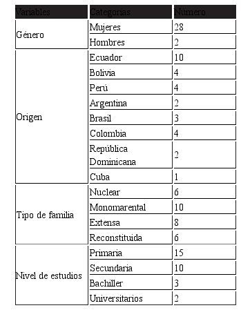Para la selección de los participantes se contó con la colaboración de una institución socioeducativa, Fundación Balia, la cual trabaja con personas en riesgo de exclusión social en España y se consultó a la institución para la selección de familias inmigrantes latinoamericanas, considerando el grado de vulnerabilidad que presentaban. Los indicadores utilizados por esta organización y aprovechados para la selección de los sujetos de estudio fueron los siguientes: situación de regularización en el país (permiso de residencia, permiso de trabajo), tipo de vivienda (unifamiliar, vivienda compartida, infravivienda), tipología familiar (nuclear, separados, monomarental, monoparental, reconstituida), se cuenta con red de apoyo, se cuenta con contrato de trabajo (precario, estable, inestable), necesidades familiares detectadas (abandono, violencia, adiciones, incapacidad), necesidades detectadas en el menor (dificultad de idioma, socialización, académica, desorden alimenticio, cargas familiares, problemas de conducta). La muestra del estudio se caracteriza por ser intencional, no aleatoria, evidenciándose una mayor participación de mujeres y predominando la procedencia ecuatoriana.