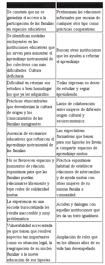 A modo de conclusión, se sintetiza en la siguiente tabla una comparación entre las dimensiones excluyentes y las transformadoras en base a las categorías de análisis identificadas en el primer nivel del análisis de resultados. Se ha pretendido reconocer a las personas inmigrantes latinoamericanas como sujetos capaces de lenguaje y acción (Habermas, 1981), buscando ampliar el campo de visibilidad del sentir y vivir de los sujetos investigados.