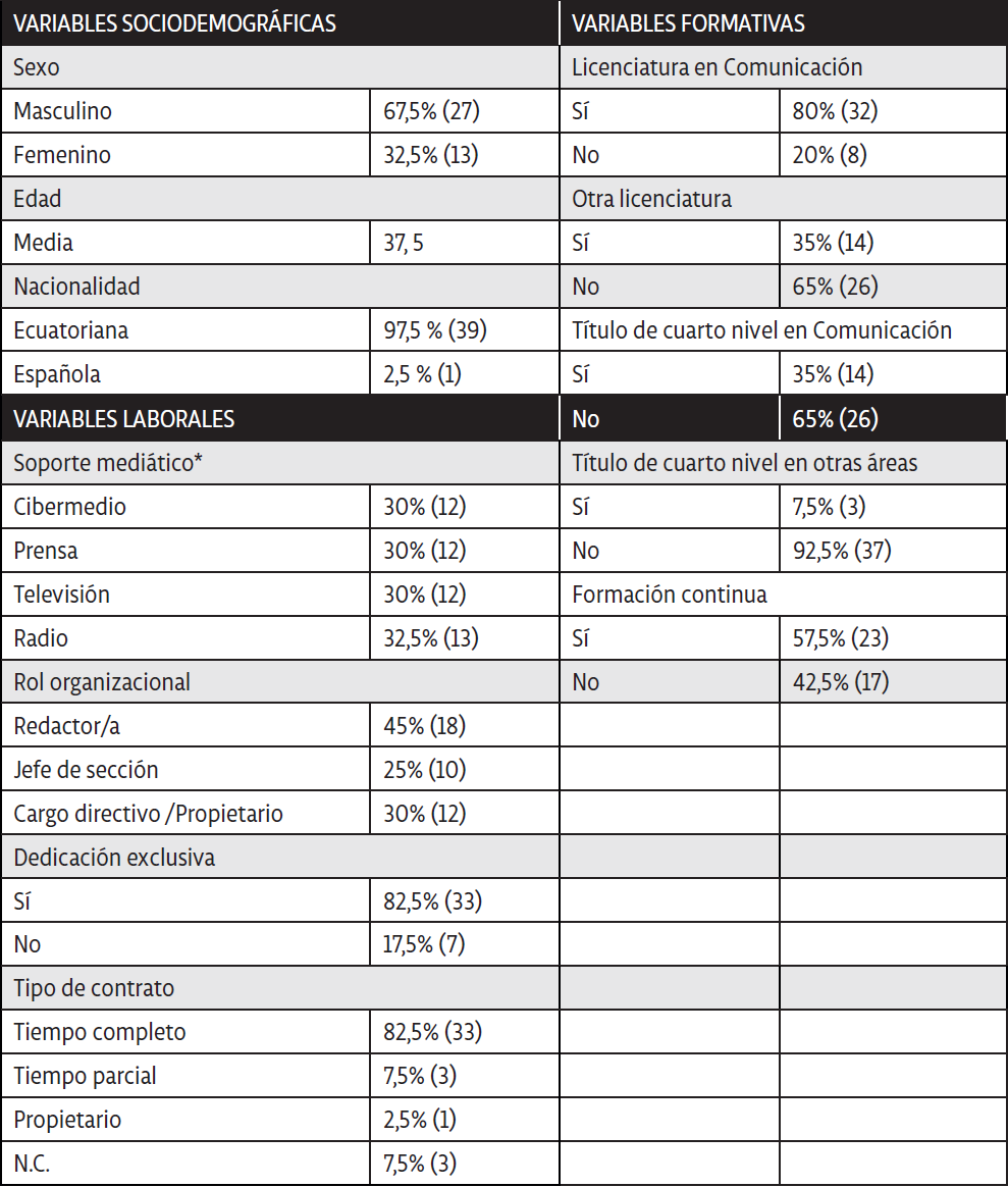 .e realizaron 40 entrevistas a periodistas ecuatorianos en activo de los cuatro soportes informativos: prensa escrita, radio, televisión, cibermedios. A los sujetos entrevistados se les garantizó el anonimato, asignando un número a cada entrevistado. En el caso de los periodistas ecuatorianos, su numeración abarca desde el Sujeto 121 hasta el Sujeto 160.