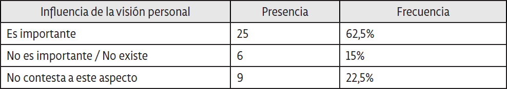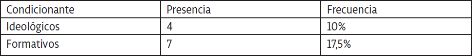 Al analizar el peso de los condicionantes relacionados con la ideología del periodista y la formación recibida, puede observarse que no se muestran como los más reconocidos por los periodistas entrevistados. En la tabla 1, se constata que los periodistas entrevistados, al ser preguntados por los condicionantes que reconocen que afectan al desarrollo de un periodismo de mejor calidad en su rutina laboral, mencionan en un 17,5% de las ocasiones los condicionantes formativos. Por su parte, los condicionantes relacionados con la ideología profesional de los periodistas presentan una menor presencia en el conjunto de los condicionantes con un 10%.