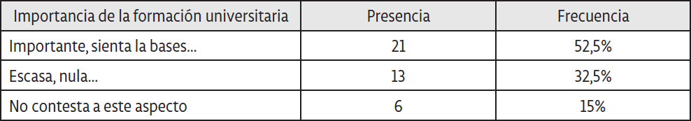 Los periodistas en sus respuestas reconocen la importancia de la formación universitaria “ya que si necesitamos una persona preparada que mejor que venga de la Universidad” (Sujeto 155). Este hecho se ha visto reforzado, desde el año 2013, por la exigencia plasmada en el artículo 42 de la Ley Orgánica de Comunicación de que “las actividades periodísticas de carácter permanente realizadas en los medios de comunicación, en cualquier nivel o cargo, deberán ser desempeñadas por profesionales en periodismo o comunicación” (Asamblea Nacional, 2013, p. 9). Los propios periodistas son conscientes de esta situación: “la ley te obliga ahora que todos tienen que tener tercer nivel, es decir, la licenciatura, haber acabado la carrera de comunicación” (Sujeto 152). Así, en la actualidad realmente “es una responsabilidad muy grande, no solo de la empresa sino del mismo periodista en tener su título profesional para que su trabajo sea respetado y el mismo esté fuera de cualquier riesgo de cumplir un trabajo que significa informar de un hecho si es que no tiene su título profesional de periodista” (Sujeto 142).