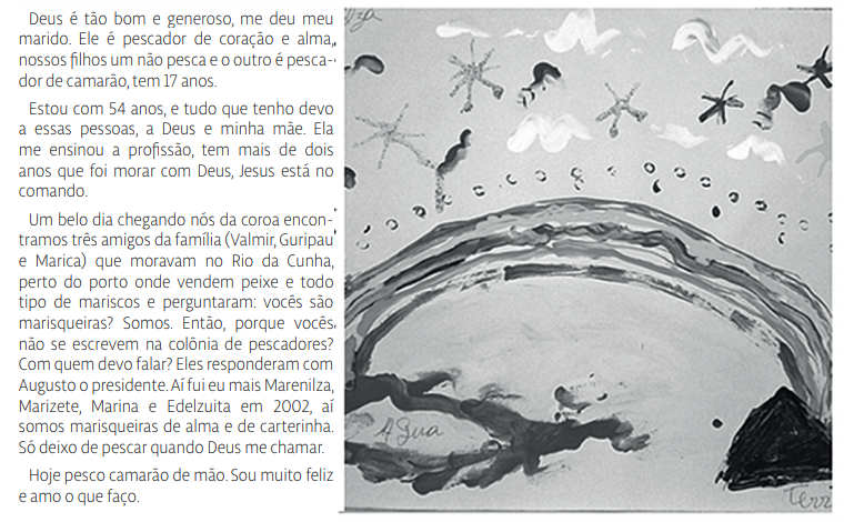 Venho de una família onde todos dependiam e dependem da pesca para sobreviver; tinha dez anos de idade quando aprendi a pescar com a minha madrinha. A vida nunca foi fácil para nós, mas me orgulho muito de ter recebido essa valiosa herança dela, pois foi com ela que aprendi a respeitar a natureza, percebi que a maré também é cultura e dela fazemos parte, descobri que a pesca é a arte do mar, onde sabemos o que ela quer e o que ela exige da gente. (Cila, 2015, p. 24)