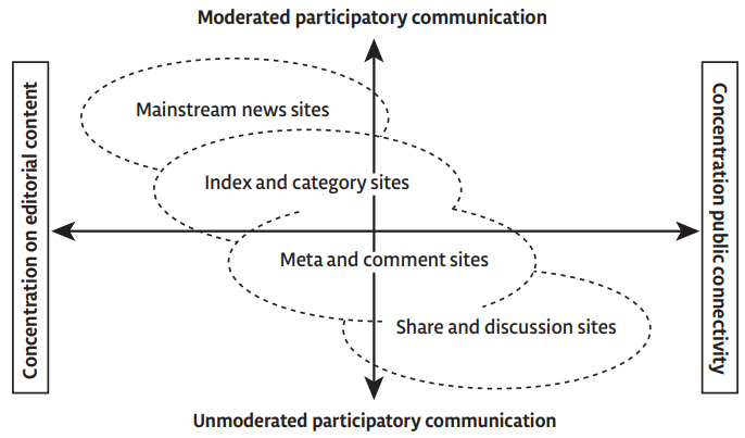 Para entender as características do tipo de mídia objeto de nossa análise, consideramos o trabalho desenvolvido pelo pesquisador Mark Deuze (2003), da Universidade de Amsterdam sobre jornalismo digital. Deuze (2003) classifica quatro tipos de mídia on-line: i) sites de mídia tradicional; ii) sites de categoria e indíces (como o Google e outros repositórios); iii) sites de comentários e meta sites (como portais observatórios, que “vigiam” e comentam coberturas de diferentes veículos de comunicação) e, finalmente; iv) sites de discussão e compartilhamento (redes sociais, p. ex.). O autor oferece uma visão interessante acerca da relação entre conteúdo focado em questões editoriais e outro focado na conectividade com o público, ambos diametralmente opostos. Numa outra dimensão, ele opõe participação moderada de leitores e a não moderada. Conforme vemos na figura abaixo: