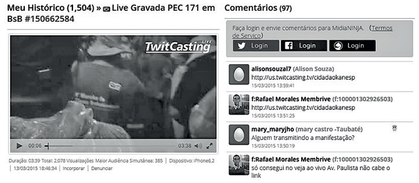 A duração dos vídeos varia entre três segundos e baixa visualização e outros com números altos de visualização e tempos maiores: 34,8 mil visualizações, com 1h e 9 segundos de duração, e outro com mais de 27 mil visualizações, de aproximadamente 20 minutos. Mesmo com uma estrutura técnica que não se compara a muitos canais de televisão, os ninjas conseguiram atingir um pico de audiência de mais de 120 mil espectadores em dias importantes de streaming – muitas emissoras não conseguem atingir essa marca de ibope. Além disso, os vídeos eram conduzidos por um único ninja, que cobria e acompanhava os ocorridos com um iPhone conectado ao plano de dados (3g ou 4g), ao mesmo tempo em que interagia com os usuários do vídeo, lendo comentários e respondendo- -os ao vivo. Por meio desses comentários, os ninjas conseguiam trocar informações com os internautas e saber o que estava acontecendo em outros pontos da cidade (ver Figura 2). A maioria dos vídeos que encontramos no canal dizia respeito à manifestação do dia 30 de junho, quando o Brasil ganhou a Copa das Confederações. Em todos eles, um ninja chamado Filipe acompanha os manifestantes, entrevistando-os, tentando falar com fontes diferentes, desde policiais, advogados, agentes de segurança e representantes do governo a manifestantes.