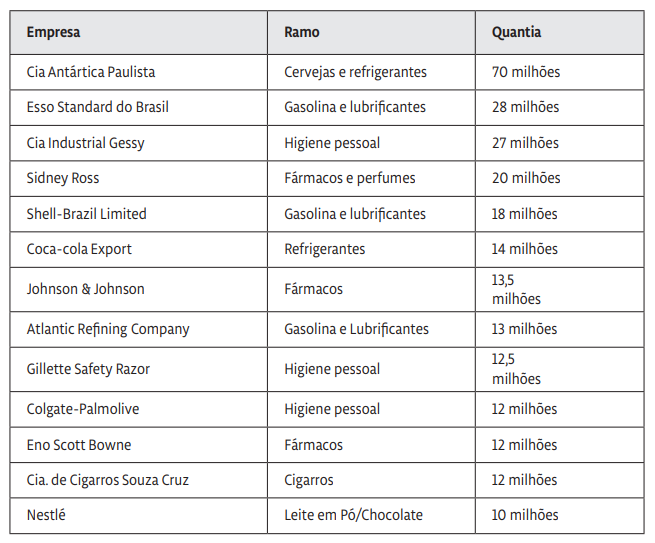 Fica ainda mais fácil entender este momento de transição da influência cultural francesa para a norte-americana entre os membros das camadas médias urbanas quando se tem acesso à lista das empresas que mais investiam em propaganda no pós-guerra. Excluindo Nestlé (Suíça), Shell (Bélgica) e Souza Cruz (Reino Unido), a maioria tinha a matriz nos Estados Unidos. Em 1947, as agências de publicidade destinaram 750 milhões de cruzeiros aos meios de comunicação.