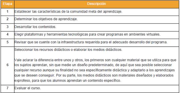 Como cualquier alternativa de aprendizaje, los programas o experiencias que se diseñen dentro de estos ambientes deben seguir un proceso de planeación didáctica, que atienda las siguientes etapas:
