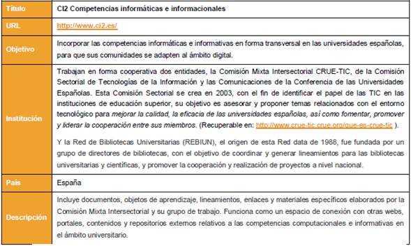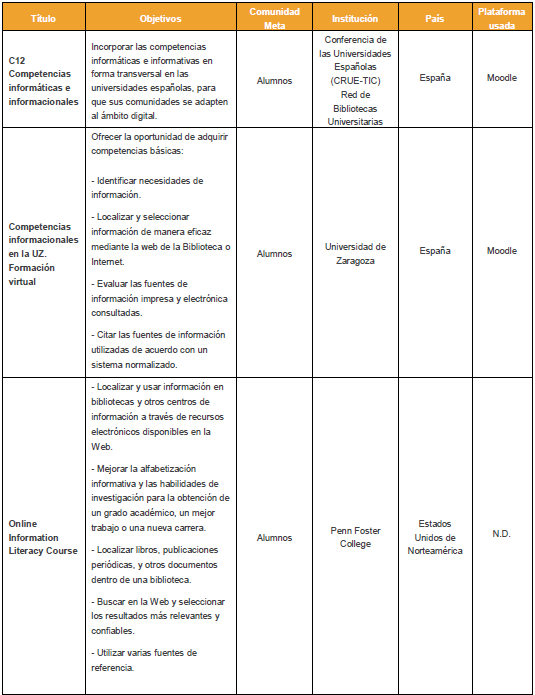 El examen de los ejemplos descritos nos permite establecer que siguen los aspectos incluidos en esta definición. Los once son acciones educativas, algunas de tipo formal (CI2 Competencias Informáticas e Informacionales; Competencias informacionales en la UZ; Online Information Literacy Course); y otras informal (Seminario CIDI; Capacitación en TIC's; Competencias genéricas en información; learn my way; Cursos MOOC; y Comunidades de Práctica).
