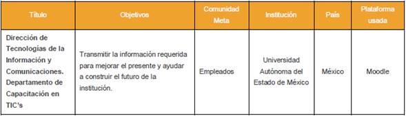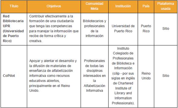 Resultados. : Se obtuvieron cuatro cuadros comparativos que examinan 5 elementos de cada experiencia: objetivos; comunidad meta; institución; país; y plataforma utilizada.