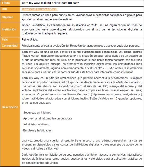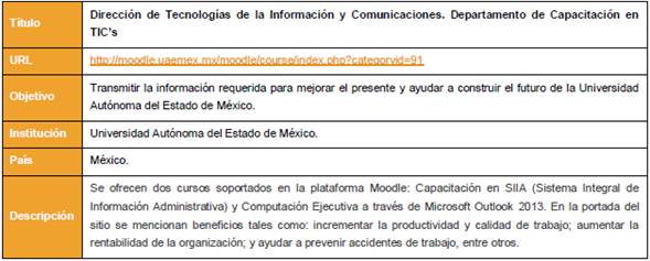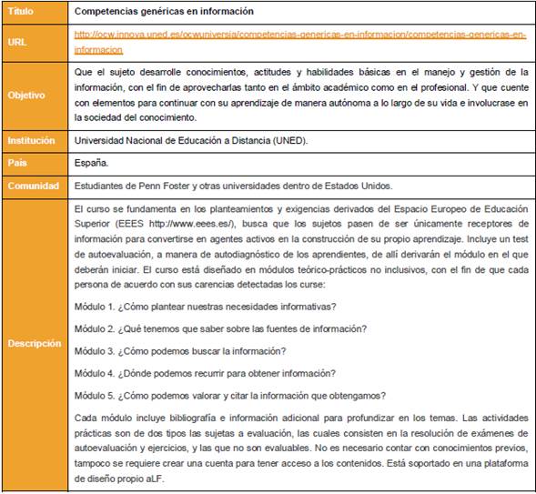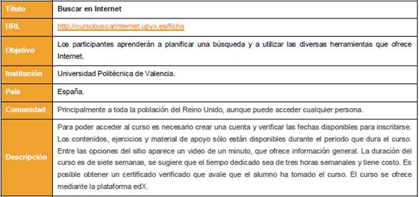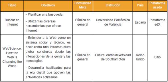 El Cuadro 5 muestra dos ejemplos de Cursos Masivos Abiertos en Línea (MOOC), si bien las comunidades meta de estas cursos pueden ser académicas, los casos que aquí se muestran están dirigidos a público en general. De acuerdo con esta comunidad, es posible deducir que los objetivos promueven el desarrollo de habilidades para el uso de las herramientas que ofrece la web con el fin de resolver problemas cotidianos.