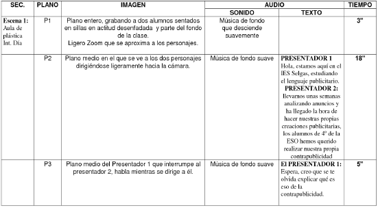 (Ver enlace Guión técnico recuperable en: http://www.uv.mx/itunesu/como-publicar/como-hacer-un-guion-para-video/. Es el documento en el que se reflejan todos los elementos que van a aparecer en las pantallas de forma secuencial. La Fig. 1 muestra un cuadro que incluye los elementos que debe contener un guión, si bien está pensado para videos, se puede adaptar para cualquier tipo de medio didáctico, para lo cual se considerarán sólo las columnas que competan.
