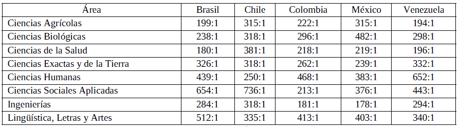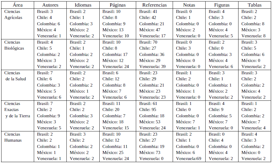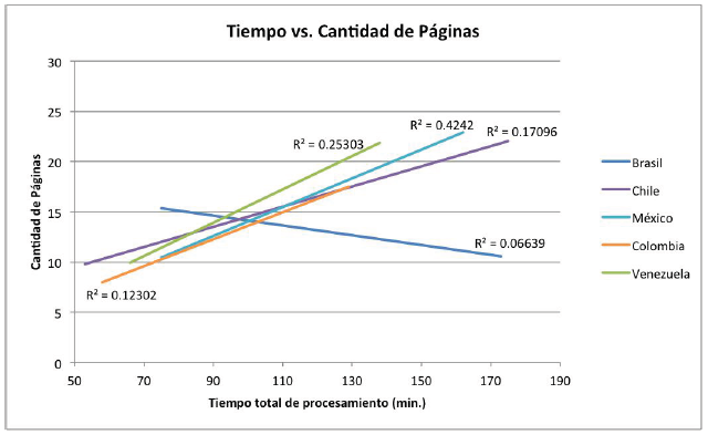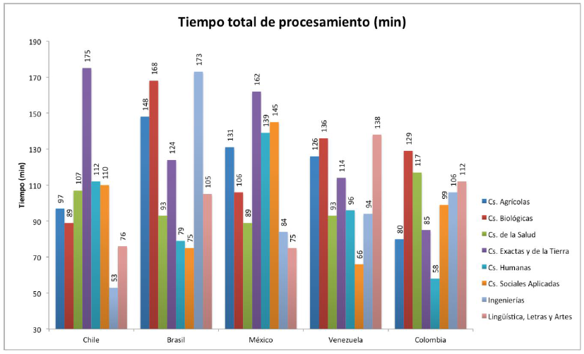 En el cuadro 2 se presenta la razón de la cantidad total de caracteres del documento entre el tiempo empleado en su procesamiento. Se observa que la cantidad de caracteres que tenga el artículo no afecta el tiempo total de procesamiento, por ejemplo, si se compara la razón en el área de Ciencias de la Salud, se observa que para Chile (381 a 1) dicha razón es un poco más del doble que para Brasil (180 a 1) y el tiempo total de procesamiento de Chile (107 min.) no es más del doble que el de Brasil (93 min.).