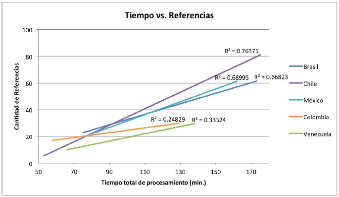 Como se observa en el cuadro 5, se puede determinar que la diferencia en el tiempo de procesamiento se debe en gran medida a la cantidad de referencias bibliográficas que tenga un artículo científico. Por ejemplo, al comparar los artículos del área de Ciencias Biológicas se observa que a pesar de que el artículo venezolano tiene muchas más páginas (24 p.) que el brasileño (10 p.), la diferencia en el tiempo de procesamiento es de 32 minutos (figura 1), debido a que este último tiene 70 referencias, mientras que el primero tiene 39. Esta misma relación entre el tiempo total de procesamiento y la cantidad de referencias es reseñada por Herrera et. al 2011, cuando establece que el tiempo de marcado depende de la cantidad y calidad de las referencias del artículo.
