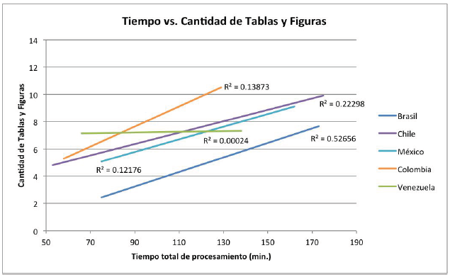 Respecto a los otros elementos de un artículo científico, como la cantidad de autores, idiomas, figuras, tablas o cuadros, notas o la cantidad de páginas que tenga el artículo, no tienen ninguna influencia significativa en el tiempo total de procesamiento de éste, usando la metodología de SciELO, en ninguno de los países en estudio. En la figura 3 se puede observar la tendencia cuando se contrasta el tiempo total de procesamiento con la cantidad de páginas que tiene el artículo y en la figura 4 se presenta esta misma comparación pero usando la cantidad de tablas y figuras; en este caso, sólo Brasil parece mostrar una relación significativa.