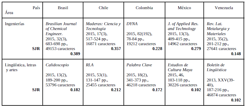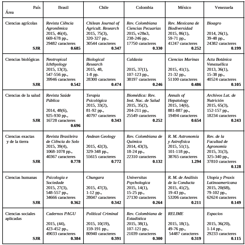 Con el objetivo de analizar una muestra de revistas que represente la realidad latinoamericana, se seleccionan 40 artículos publicados en revistas científicas latinoamericanas, haciendo uso del ranking de revistas del Scimago Journal & Country Rank de 2014 (SCImago, 2007), y bajo el criterio de seleccionar artículos publicados en revistas que posean valores altos, medios y bajos del Índice de Impacto (SJR). En el cuadro 1 se muestran las revistas seleccionadas por área y país y los datos específicos del artículo por procesar. El método de selección consiste en escoger la revista, por área de conocimiento, que tenga el mayor SJR de su país de edición.