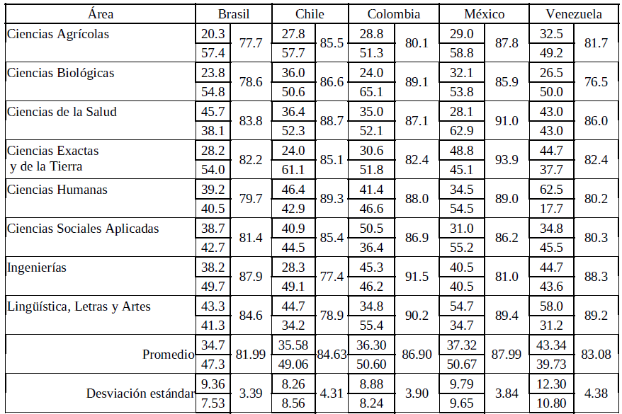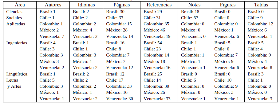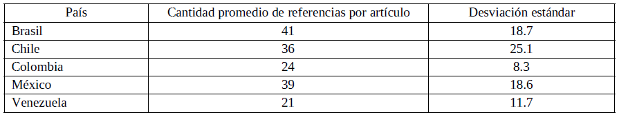 En el cuadro 6 se muestra que las cantidades promedio de referencias por artículo son muy similares para Brasil, Chile y México, siendo aproximadamente el doble que la cantidad de referencias de los artículos de Colombia y Venezuela.