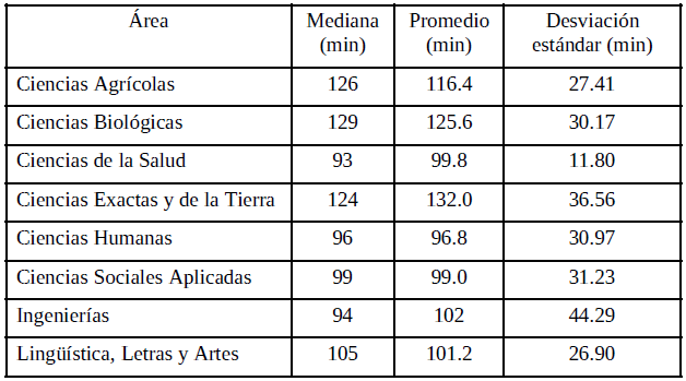 Con estos tiempos medidos se puede calcular la cantidad estimada de tiempo que toma procesar un número completo de una revista, lo cual dependerá de la cantidad de artículos que se publiquen en dicho número. Por ejemplo, si es un número de una revista del área de Ciencias Sociales Aplicadas que publica 12 artículos, su tiempo total de procesamiento usando la metodología de SciELO es aproximadamente de 20 horas; pero si la revista es del área de Ciencias Exactas y de la Tierra, y tiene la misma cantidad de artículos, el tiempo será de 27 horas. Es importante observar la dispersión que tiene el tiempo promedio de procesamiento de un artículo cuando se pretende hacer dichas estimaciones.